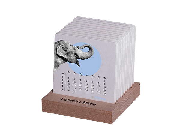 Строгий деловой стиль у календаря Caparol. На массивной деревянной подставке в специальных углублениях размещаются картонные таблички с месяцами. По истечении месяца, табличка перемещается в конец подставки.